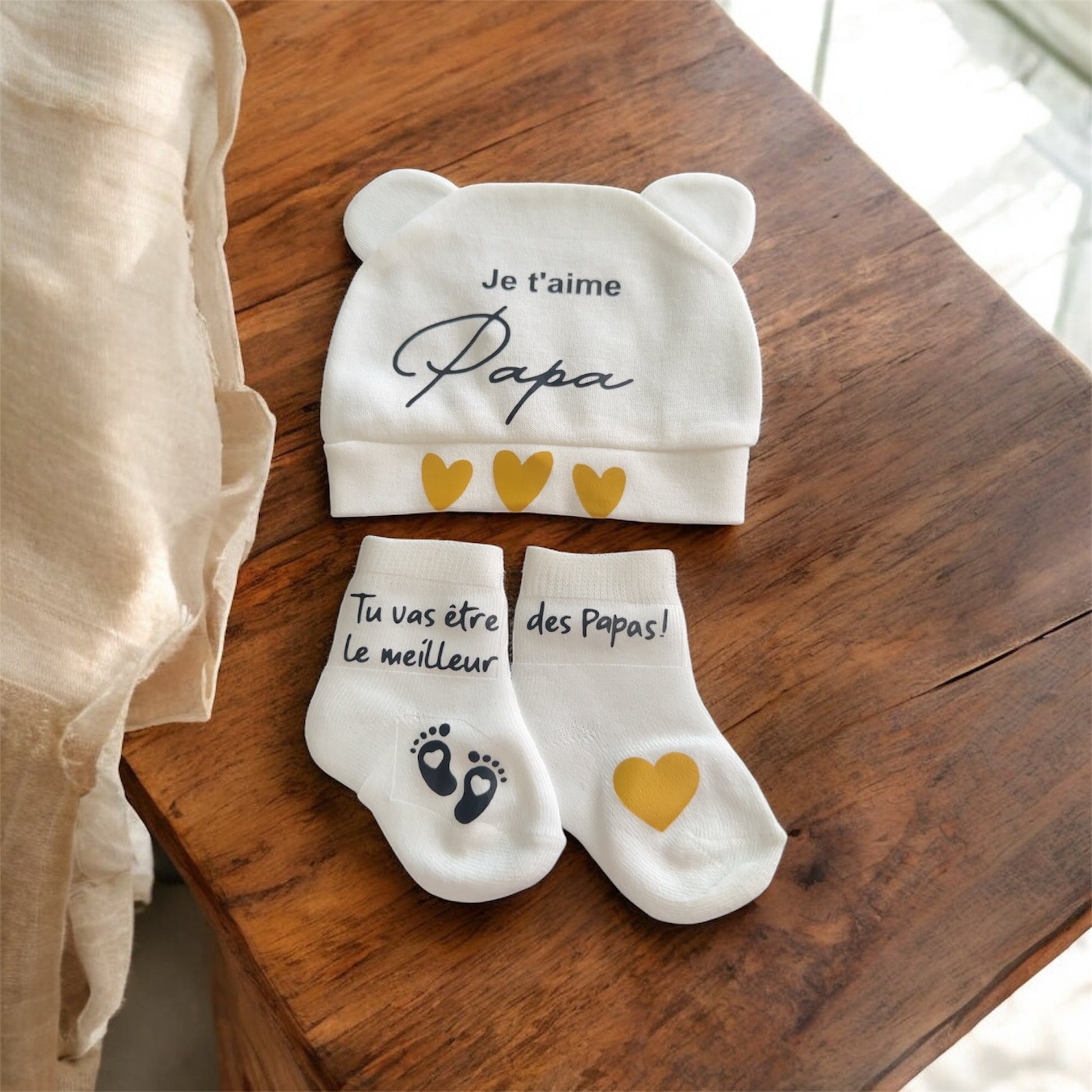 Ensemble naissance “Je t’aime Papa” – Bonnet et chaussettes bébé – Cadeau futur papa personnalisé